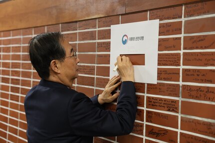 Paju, Gyeonggido [Kyonggi-do], South Korea - The republic of Korea's Prime Minister, Han, Deok-soo (left), signs on a brick inside the dining facility at Camp Bonifas during his visit to meet with United Nations Command Security Battalion-Joint Security Area troops, April 1.