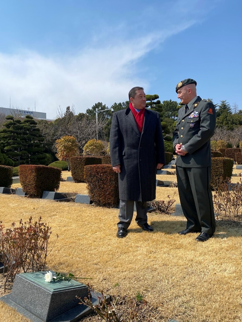 Major Ekrem Karadeniz, the Royal Netherlands Army Officer in attendance, had a personal connection to the ceremony because his Turkish grandfather served in the Korean War. “My grandfather came here as a volunteer at twenty-two years old with four friends after hearing on the radio that Turkey would establish a Brigade. Out of the four friends, only three returned home. While the friend is not buried at UNMC due to where they fell, the Turkish Battalion Commander who took great care of my grandfather during the Korean War is buried at UNMC, and I was able to put a flower on his grave after the ceremony.”